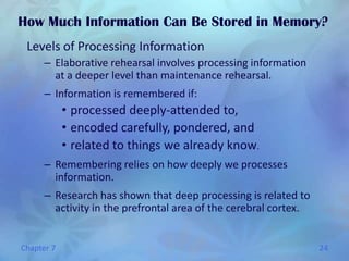 Produce some short-term remembering but fail to produce longer-term memories. One of seven fundamental abilities that determine behavior. It provides more retrieval cues when we need to recall information The results of Bartletts research on peoples memory for very unusual stories illustrated which of the following.